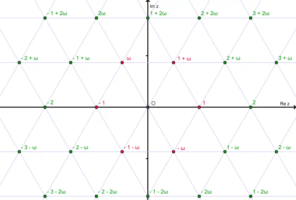 Na płaszczyźnie zespolonej liczby całkowite Eisensteina są węzłami regularnej sieci trójkątnej (złożonej z trójkątów równobocznych, jak na rysunkach poniżej).