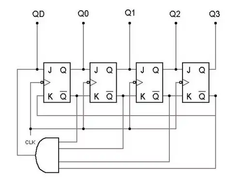 Najprostsza wersja licznika jest zbudowana z takiej samej liczby przerzutników, co liczba przewidywanych stanów. Przy poniższej realizacji konstrukcji rejestru użyto przerzutników JK.