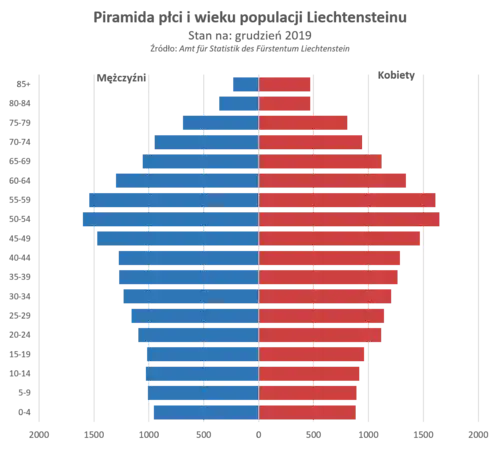 Społeczeństwo Liechtensteinu jest społeczeństwem starzejącym się, o czym świadczy postać piramidy płci i wieku regresywnej. Na podstawie piramidy płci i wieku można stwierdzić, że Liechtenstein znajduje się w ostatniej fazie rozwoju demograficznego. Piramidę płci i wieku Liechtensteinu odróżnia od analogicznych wykresów w innych państwach europejskich (np. Niemczech lub Polsce), brak powtarzającego się cyklicznie echa powojennego niżu demograficznego. Jest to związane z nieuczestnictwem Księstwa w II wojnie światowej, a co za tym idzie z brakiem znaczących strat ludnościowych.