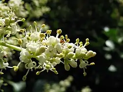 - Kremowobiałe lub barwy kości słoniowej, o mocnym zapachu. Zebrane w wydłużonych szczytowych wiechach o długości 10–20 cm.
