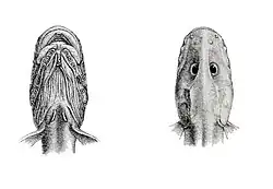 Głowa likomura widziana od góry (po prawej) i od dołu (po lewej)