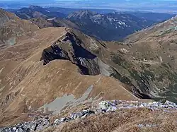 ![]() Liliowy Karb na skrzyżowaniu ścieżek, na prawo od Siwego Zwornika. W głębi szczyty Ciemniaka, Tomanowego Wierchu Polskiego, Kamienistej | |