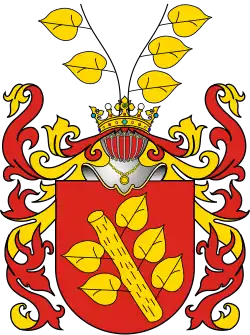 W polu czerwonym ostrzew lipy złota, w skos z pięcioma takimiż listkami, dwoma od spodu, trzema od góry. Klejnot: dwie gałązki lipy, złote, z prawej z trzema takimiż listkami, z lewej - z dwoma.