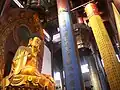 Do klasztoru wchodzi się przez budynek Czterech Niebiańskich Królów, na którym znajduje się napis wykonany przez cesarza Kangxi – 云林禅寺 (Klasztor chan Chmur i Lasu). Na końcu dziedzińca znajduje się główny budynek klasztoru – Gmach Mahaviry, 大雄宝殿, pinyin Dàxíong Bǎodiàn, którego wysokość sięga 33,6 metra. W jego wnętrzu znajduje się drewniany (wyłożony płatkami złota) posąg Buddy Śiakjamuniego. Jest to największa drewniana rzeźba w Chinach. Z tyłu tego posągu znajduje się relief przedstawiający bodhisattwę Guanyin na tle 150 słynnych buddystów. Po obu stronach wnętrza znajdują się wyobrażenia 18 znanych buddystów. Budynek ten wybudowany jest w stylu Qing, który naśladował styl epoki Tang.