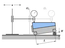 Do pomiaru liniałem sinusowym niezbędna jest płaska płyta pomiarowa, płytki wzorcowe oraz czujnik w podstawie. Pomiar kąta polega na dobraniu takiego stosu płytek wzorcowych H umieszczanych pod jednym z walców (rys. 2), aby górna powierzchnia mierzonego przedmiotu umieszczonego na liniale byłą równoległa do płyty pomiarowej. Równoległość kontroluje się za pomocą czujnika umieszczonego w statywie. Jeżeli nie uda się doprowadzić do równoległości to należy zanotować wskazania czujnika i na obu końcach powierzchni przedmiotu oraz odległość pomiędzy punktami pomiarowymi. Wynik pomiaru jest sumą kąta pochylenia liniału oraz poprawki wynikającej z nierównoległości: