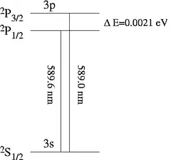 Dokładniejsza analiza widmowa wykazuje, że linia D sodu składa się z dwóch linii (stąd nazwa dublet sodowy), leżących blisko siebie (o długościach fali 589,592 nm oraz 588,995 nm). Linie te pochodzą od przejść elektronowych między termami wzbudzonymi sodu 2P3/2 i 2P1/2 a termem podstawowym 2S1/2. Obecność dwóch linii zamiast jednej wynika z rozszczepienia termu 2P na dwa termy 2P1/2 i 2P3/2, co jest przykładem sprzężenia spinowo-orbitalnego.