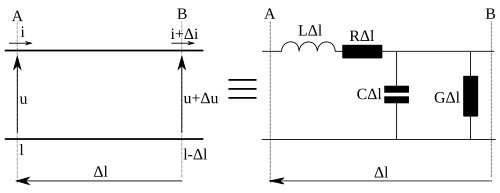 co po podziałaniu na obydwie strony pierwszego z równań operatorem różniczkowania po długości i wstawieniu drugiego równania oraz podziałaniu na obydwie strony drugiego z równań operatorem różniczkowania po długości i wstawieniu pierwszego równania prowadzi w rezultacie do układu równań typu falowego opisujących zmiany napięć i prądów w linii transmisyjnej (tzw. równania telegrafistów). Jednoznaczne rozwiązania tego układu otrzymuje się przy ustalonym obciążeniu końca linii: