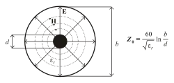 i jest zawsze mniejsza od prędkości światła w próżni Przykłady linii transmisyjnych (linie ciągłe są liniami sił pola elektrycznego E, zaś przerywane magnetycznego H, – względna przenikalność elektryczna i – względna przenikalność magnetyczna ośrodka o charakterze dielektryka lub magnetyka, który w linii pełni rolę izolatora):