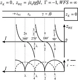 | Zwarcie linii. | Pierwsze minimum napięcia przypada w odległości λ/2 od końca. | ![]() | |
