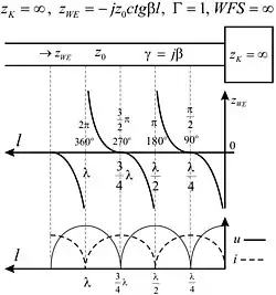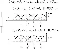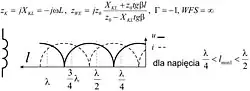 | Obciążenie linii reaktancją indukcyjną | Pierwsze minimum napięcia lokuje się pomiędzy λ/2 a λ/4. | ![]() | |