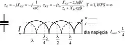 | Obciążenie linii reaktancją pojemnościową | Pierwsze minimum napięcia lokuje się pomiędzy odległością λ/4 a końcem linii. | ![]() | |