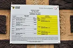 - ↑ Koleje Dolnośląskie: Linia D12 Wrocław Główny – Legnica – Bolesławiec – Zebrzydowa – Lwówek Śląski – Jelenia Góra. Liniowy rozkłady jazdy pociągów ważny od 12 czerwca do 3 września 2016 r.. www.kolejedolnoslaskie.eu. [dostęp 2016-08-10]. [zarchiwizowane z tego adresu (2016-08-11)]. (pol.).