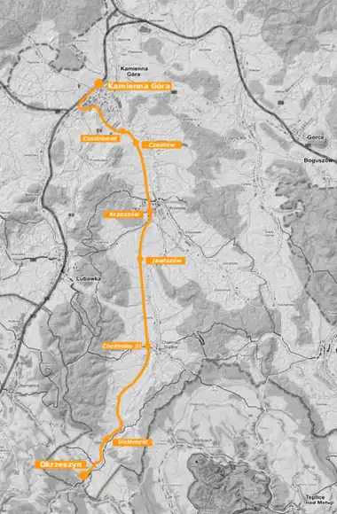 Linię poprowadzono z Kamiennej Góry w stronę Okrzeszyna zasadniczo w kierunku południowym[6].