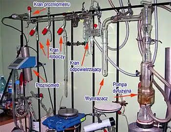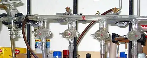 - Linie próżniowo-azotowe, które składają się z dwóch równoległych rur. W jednej rurze panuje próżnia, zaś w drugiej niewielkie nadciśnienie gazu obojętnego (np. azotu). Stanowiska robocze składają się z kraników dwudrożnych, których przekręcenie o 180° umożliwia szybkie przełączanie się z azotu na próżnię. Na końcu kraników są zwykle oliwki, na które zakłada się węże łączące linię z innymi elementami aparatury. W liniach próżniowo azotowych nie utrzymuje się zwykle zbyt wysokiej próżni, lecz w zakresie 10−3-10−2 atm.