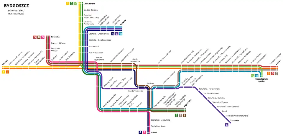 Od 8 stycznia 2022 w Bydgoszczy funkcjonuje 11 linii tramwajowych obsługiwanych przez jedno- i dwuwagonowe składy oraz przegubowe składy niskopodłogowe[1].