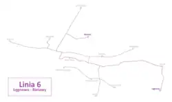 | Linia utworzona w roku 1953 po wybudowaniu linii Brda. Jej obecna trasa obowiązuje od 10 czerwca 1987. Łączy ona Bielawy i Uniwersytet Kazimierza Wielkiego z centrum, halą Łuczniczka, Czerskiem Polskim, Zimnymi Wodami i Łęgnowem. Linia 6 jest obsługiwana przez dwuwagonowe składy. | ||||||