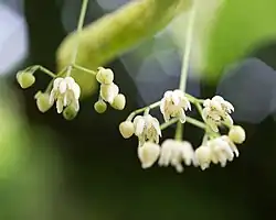 - Zebrane w wierzchotkach (o długości 7–15 cm) wyrastających z kątów eliptycznych podsadek. Mają 5 działki kielicha o odwrotnie jajowatym kształcie i dorastające do 4–6 mm długości. Płatków jest 5, mają odwrotnie jajowaty kształt i osiągają do 5–11 mm długości[5].