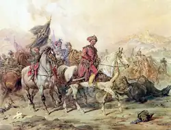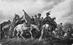 ![]() Lisowczyk – mal. Juliusz Kossak (ok. 1860–1865; kopia obrazu Rembrandta Jeździec polski) | |