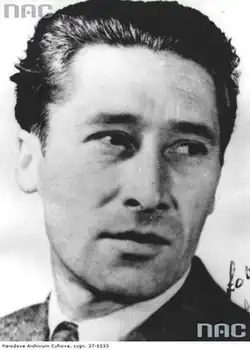 - Adam Benrad (1919–1987) ps. Drukarz – kapitan, harcerz, oficer Polskich Sił Zbrojnych, Armii Krajowej, Kedywu Okręgu Łódź AK, więzień UB (1945). Przeszkolony ze specjalnością w dywersji, zaprzysiężony na rotę ZWZ-AK 4 sierpnia 1943 r. w Chicheley (Wielka Brytania)[34][35], zrzucony do okupowanej Polski w nocy 12/13 kwietnia 1944 r. w sezonie operacyjnym „Riposta”, w operacji lotniczej „Weller 14”, w ekipie skoczków nr XLI, z samolotu Halifax JW-272 „D” (1586 eskadra PAF). Start z lotniska Campo Casale nieopodal Brindisi, zrzut na placówkę odbiorczą „Mysz” w okolicach miejscowości Bełżyce (13 km od Lublina). Razem z nim skoczyli: ppor. Zbigniew Mrazek ps. Aminius, ppor. Tadeusz Żelechowski ps. Ring oraz kurier Delegatury Rządu na Kraj plt. Jan Ciaś ps. Kula[36][15].