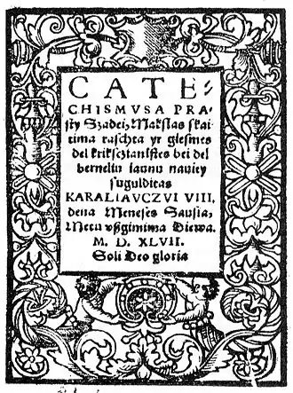 Druga połowa wieku XVI przyniosła Litwie ożywienie kulturalne związane z reformacją katolicką. W 1570 powstało wileńskie Kolegium Jezuickie, od roku 1578 mające status akademii. W Akademii Wileńskiej rozwijały się obok innych także nauki filologiczne, w skład których wchodziło także pierwotne zainteresowanie językiem litewskim – dzięki zainteresowaniu oo. jezuitów ewangelizacją ludu, powstały pierwsze słowniki, gramatyki i podręczniki języka litewskiego. Istniały też przekłady literatury religijnej, katolickie (Mikalojus Dauksza, Katechismas, Postilla catholicka) i protestanckie (Jurgis Petkevičius, Polski z litewskim katechizm, Wilno 1598; Jokūbas Morkūnas, Postilla lietuviška, Wilno 1600).
