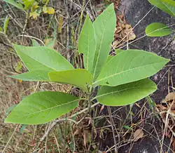 - Naprzemianległe. Mają kształt od eliptycznie lancetowatego do odwrotnie jajowatego. Mierzą 6–14 cm długości oraz 3–6 cm szerokości. Młode liście są owłosione. Nasada liścia jest klinowa. Blaszka liściowa jest o wierzchołku od tępego do ostrego. Ogonek liściowy jest mniej lub bardziej owłosiony i dorasta do 15–30 mm długości[5].