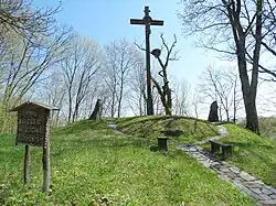 - dwa kamienie o imionach Jonas i Povilas – „stojące” po obu stronach krzyża, przypominające modlące się postacie.