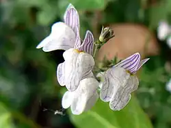 - Wyrastają w wydłużonych, luźnych gronach. Kwiaty osadzone są na szypułkach osiągających 3–6 mm długości i wsparte są przysadkami wyraźnie mniejszymi od liści. Kielich z lancetowatymi, zaostrzonymi działkami do 3,5 mm długości. Korona grzbiecista, niebieskawoliliowa lub niebieskawobiała, czasem żółtawobiała, z fioletowymi kreskami i z żółtą, rzadko białą gardzielą. Osiąga do 1,5 cm długości wraz z wyprostowaną ostrogą. Pręciki są cztery, dwusilne, i nagie poza nielicznymi włoskami u nasady. Zalążnia kulista, naga, długości 4–5 mm[8].