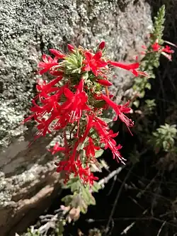 - Wyrastają skupione po kilka w kwiatostanach na szczytach pędów. Kielich jest złożony z 5 zrośniętych w dole działek, rurkowaty, zielony lub błoniasty, zwłaszcza na łączeniach działek, promienisty lub nieco grzbiecisty[5][6]. Płatków korony jest 5, zrośniętych na znacznej długości w rurkę, na końcach płatki są wolne, rozchylone i zaokrąglone. Korona ma barwę szkarłatną do czerwonej z białą gardzielą lub niebieskawą[6]. Pręcików jest 5, wystających z rurki korony[6], o nitkach nagich lub owłosionych, przyrośniętych do płatków w dolnej części rurki[5]. Zalążnia jest górna, powstaje z trzech owocolistków, z licznymi zalążkami w komorach, zwieńczona jest pojedynczą, smukłą szyjką słupka i trójdzielnym znamieniem[6].