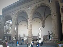 Loggia dei Lanzi, zwana także: Loggia della Signoria lub Loggia Orcagni. Została zaprojektowana przez Benciego di Cione i Simone Talentiego w latach 1376–1382. Jest to niewielka, otwarta, florencka budowla przy placu della Signoria i odchodzącym od niego Piazza degli Uffizi (dziedziniec pomiędzy skrzydłami zabudowań Galerii Uffizi). Łuki arkad wspierają się na masywnych filarach o bogato profilowanych trzonach. Nad nimi, w ozdobnych kasetonach, umieszczono alegorie cnót zaprojektowane przez Agnolo Gaddiego w latach 1384–1389. Nad nimi herby możnych rodów florenckich. Przy schodach prowadzących do galerii ustawiono rzeźby lwów (jeden z nich jest dziełem Flaminio Vacciego z 1600 r., drugi zabytkiem z czasów antycznych. Loggia została zbudowana jako miejsce spotkań Signorii, obecnie znajdują się tu znane rzeźby: