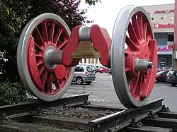 43 Koło napędowe – koła napędzane przez tłoki, których obrót wywołuje ruch lokomotywy. Specjalne obciążniki powodują, że środek ciężkości osi napędowych jest równy ze środkiem rotacji kół.