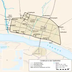 Pomiędzy 190 a 225 miasto zostało otoczone murem miejskim, tak zwanym Murem Londyńskim. Miał on 3 kilometry długości, 6 metrów wysokości i był szeroki na około 2,5 metra. Pozostałości muru są wciąż widoczne i można je podziwiać w poniższych miejscach: