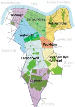 Gmina dzieli się na 21 okręgów wyborczych[5] które nie pokrywają się dokładnie z podziałem na obszary, zaś mieszczą się w 3 rejonach tzw. borough constituencies – Bermondsey and Old Southwark, Camberwell and Peckham i Dulwich and West Norwood[6].