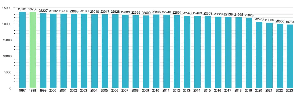Wykres liczby ludności Lubartowa (stan na 31 grudnia każdego roku)[34]: