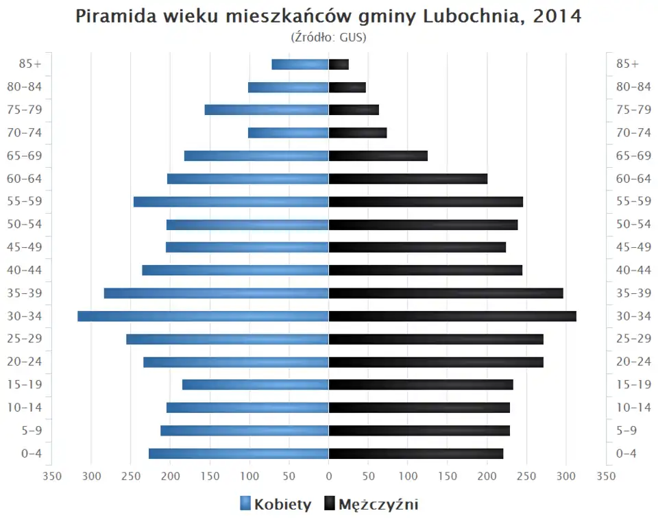 - Piramida wieku mieszkańców gminy Lubochnia w 2014 roku[1].
