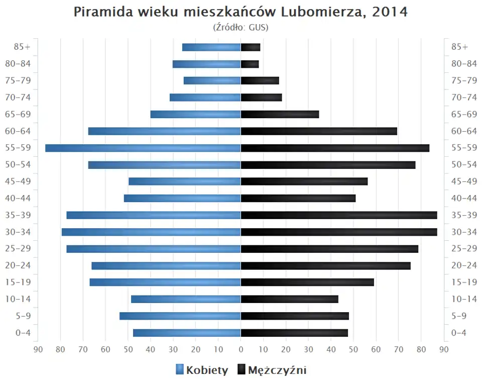 Piramida wieku mieszkańców Lubomierza w 2014 roku[20].