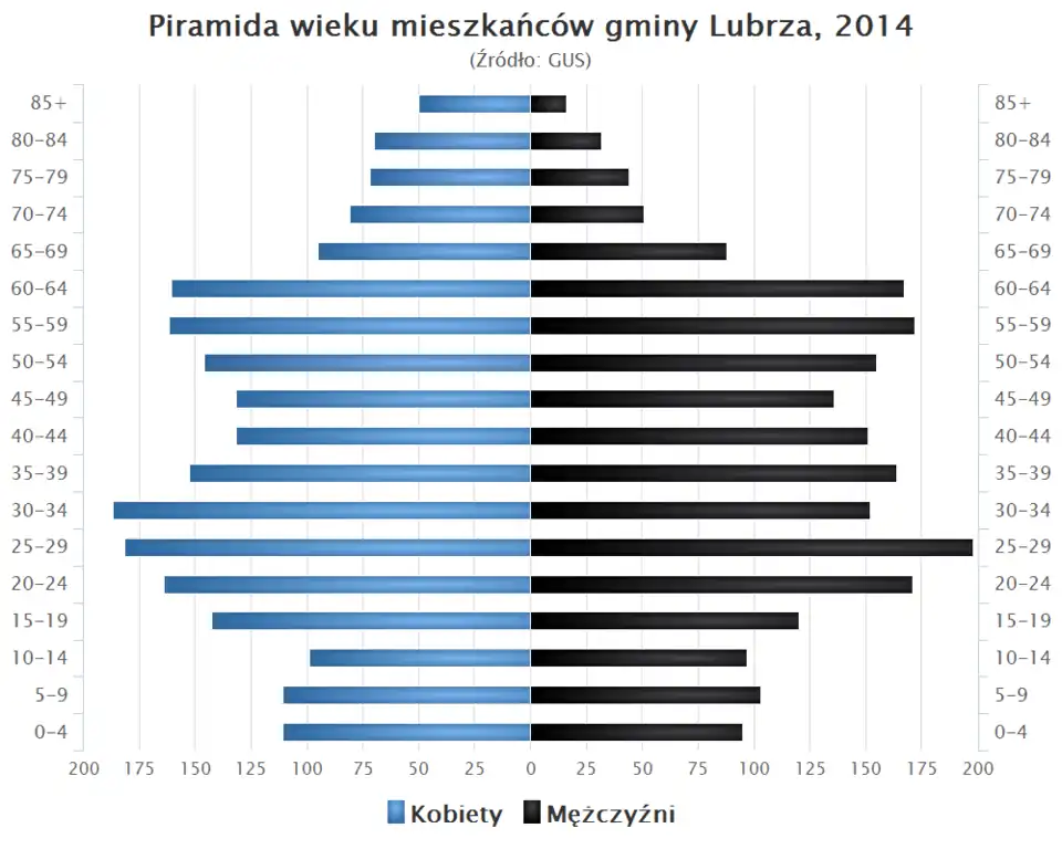 - Piramida wieku mieszkańców gminy Lubrza w 2014 roku[1].