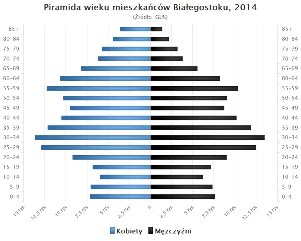 Piramida wieku mieszkańców Białegostoku w 2014 roku[11].