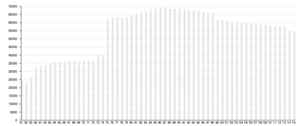 | 1975 | 62 146 | po przyłączeniu Brzezin Śląskich, Dąbrówki Wielkiej, Brzozowic oraz Kamienia |