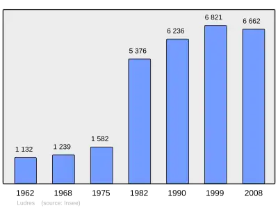 Według danych na rok 1990 gminę zamieszkiwało 6236 osób, a gęstość zaludnienia wynosiła 762 osób/km² (wśród 2335 gmin Lotaryngii Ludres plasuje się na 71. miejscu pod względem liczby ludności, natomiast pod względem powierzchni na miejscu 733.).