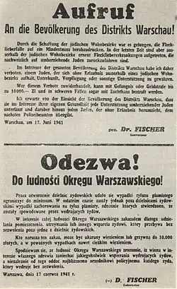 - ↑ Krzysztof Dunin-Wąsowicz, „Raporty Ludwiga Fischera” – biogram Fischera na stronach Pracy zbiorowej, „Raporty Ludwiga Fischera gubernatora dystryktu warszawskiego 1939-1944”, Książka i Wiedza, Warszawa 1987, ISBN 83-05-11197-0, s. 22.