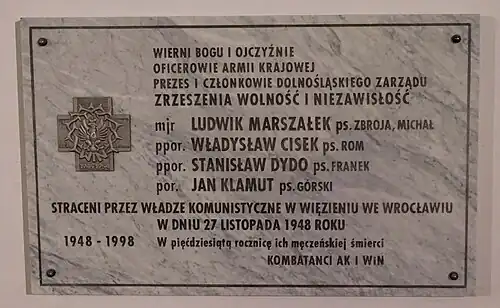 Na terenie Dolnego Śląska z końcem 1945 r. zaczęła działać nielegalnie organizacja Wolność i Niezawisłość, w skrócie WiN. Trzon tej organizacji stanowili byli członkowie Armii Krajowej, którzy nie zrozumieli, bądź nie chcieli zrozumieć doniosłych historycznych przemian, jakie dokonały się w Polsce z chwilą zwycięstwa obozu Demokracji Ludowej, a ulegając propagandzie międzynarodowej reakcji obrali drogę negacji i wstecznictwa działając przeciwko Narodowi i Państwu w służbie obcych interesów. [...] Oskarżeni Marszałek, Cisek i Dydo – to ludzie młodzi, ludzie niewątpliwie energiczni, utalentowani i zdolni – ludzie, którzy swą pozytywną pracą dla dobra Narodu i Państwa mogliby przynieść niewątpliwie dużo korzyści i pożytku [...] wybrali jednak drogę nie konstruktywnej pracy dla dobra dźwigającej się z ruin i zgliszcz Polski, lecz drogę negacji, drogę przeszkadzania wszelkim poczynaniom odbudowującej się Polski Ludowej. - ↑ Cytaty uzasadnienia wyroku i listów do rodziny za tekstem Krzysztofa Szwagrzyka w „Tygodniku Powszechnym”.