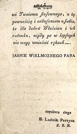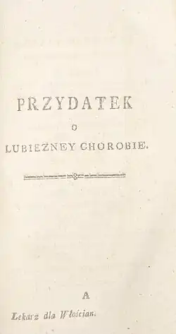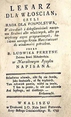 Lekarz dla włościan, czyli rada dla pospólstwa, w chorobach i dolegliwościach naszemu kraiowi albo właściwych, albo po wiekszey części przyswoionych, każdemu naszego Kraiu Mieszkańcowi do wiadomości potrzebna przez brata Ludwika Perzynę Zakonu Braci Miłosierdzia w narodowym języku napisana. Kalisz, in 8vo 1793.