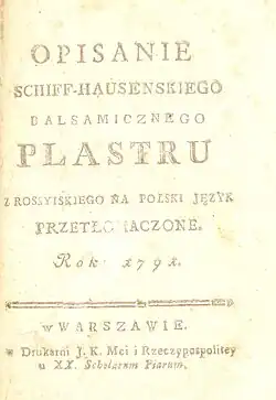 Nauki cyrulickiey krótko zebraney t.j. nauki dla chcących się uczyć cyrulickiey umiejętności dokładnie napisaney wszystkim oraz gospodarzom i wszelkim zgromadzeniom tak duchownym jako i świeckim nieuchronnie potrzebney, a dla łatwiejszego każdego poięcia, w pytaniach i odpowiedziach ułożoney. Część I w 1792. Część II i III w 1793. Kalisz In 8vo. Razem 750 stron. W tym jako dodatek: Sposób urzędowych relacyi z wyprowadzonych wizyi, czyli oględzin ciał ludzi, przez gwałt różnego zabójstwa z tego świata zgładzonych, lub też tylko pokaleczonych.