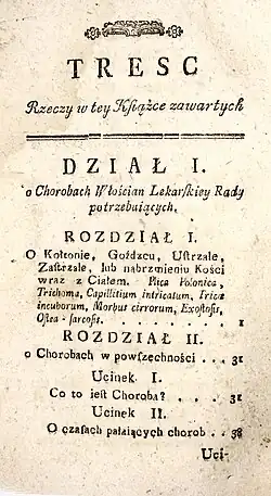 W Lekarzu dla włościan… bardzo obszerny rozdział pierwszy poświęcony jest tzw. kołtunowi (pierwotnie kolton, od francuskiego coltin = kapelusz, czapa tragarza), chorobie zwanej też gośćcem, zastrzałem, postrzałem, nabrzmieniem kości wraz z ciałem, trichoma, Capillitium intricatum, Plica Polonica, Tricoe incuborum, morbus cirrorum, Exostosis, Osteasarcosis.