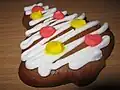 ![]() | Lukier średni zagęszczony/konsystencja kremowa stała | do dekoracji przez końcówki cukiernicze (tylki). Jest najczęściej stosowaną konsystencją przy dekoracji tortów. Uzyskane wzory są dokładniejsze i drobniejsze, dzięki czemu zdobienia mogą być bogatsze i bardziej wyszukane. Można z niego wykonać stojące figurki takie jak z masy cukrowej. Po zaschnięciu lukier utwardza się. |