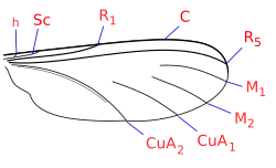 Tułów ma krótkie szczecinki na antepronotum, postpronotum i skutum. Delikatne szczecinki na tarczce ustawione są w nieregularny, poprzeczny rządek. Pleury tułowia są nagie z wyjątkiem gęstych rzędów dwukrotnie dłuższych niż na tarczce szczecin na silnie wystających laterotergitach. Skrzydła mają błonę gęsto porośniętą wyraźnymi, mikroskopowymi włoskami. Użyłkowanie skrzydła cechuje żyłka subkostalna co najwyżej w ⅓ tak długa jak pierwsza żyłka radialna, brak żyłki radialnej R2+3, zanikła żyłka medialna z wyjątkiem zewnętrznych ⅔ jej pierwszej i drugiej gałęzi, zanikłe nasadowe ¾ żyłki kubitalnej CuA1, słabo zaznaczona tylna żyłka kubitalna oraz krótka żyłka analna[1]. Mniej lub bardziej wydłużona żyłka poprzeczna radialno-medialna ma przebieg skośny lub wzdłużny[3].