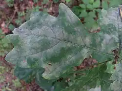 - mączniak prawdziwy dębu (Erysiphe alphitoides)[4]