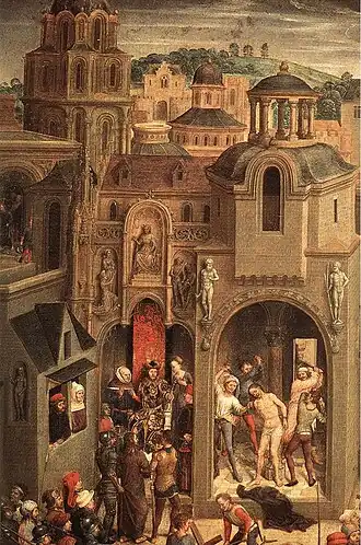 Niektóre sceny zachowują charakter prawie baśniowy, który przemienia się w realistyczny dramatyzm dopiero w scenach na Golgocie. Warto zauważyć pewien detal: nad portalem pomieszczenia, w którym Chrystus stoi przed Piłatem, znajdują się płaskorzeźby przedstawiające sąd Salomona. Postać klęcząca w lewym dolnym rogu obrazu to Tommaso Portinari, florencki bankier zamieszkały w Brugii, który zamówił dzieło. W prawym dolnym rogu uwidoczniona jest zaś jego żona Maria Baroncelli[2].