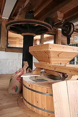 - młyn właściwy – składający się z zespołu maszyn do rozdrabniania (mlewniki, wymielacze) oraz urządzeń do oddzielania od mąki lub kaszy części otrębiastych przez odsiewanie (odsiewacz) i odwiewanie (wialnie kaszkowe) oraz szereg urządzeń transportowych: podnośników, przenośników i podajników, a w nowych młynach urządzeń pneumatycznych;