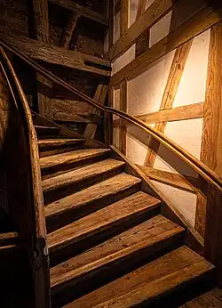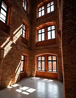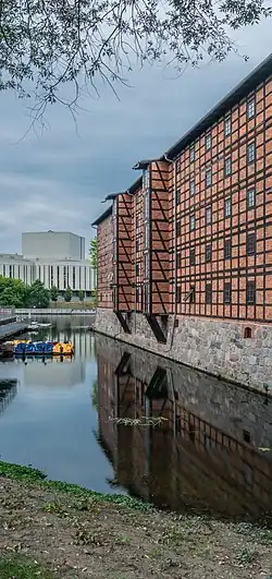 Skrzydła wschodnie i zachodnie wykonano w konstrukcji szachulcowej. Są to budynki pięciokondygnacyjne. Skrzydło zachodnie od strony rzeki stoi na wysokim kamiennym cokole oraz posiada wykusze, w których urządzono wejścia transportowe[10].